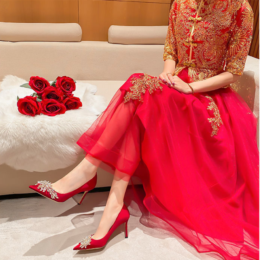 Elevate your bridal ensemble with our Red Wedding Shoes featuring Female High Heels. These exquisite heels are designed to make a bold statement, exuding elegance, passion, and a touch of drama for your special day.